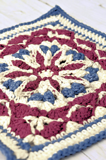 This free crochet pattern for a 12” Granny Square is perfect on its own or paired with other blocks in a full afghan. Inspired by vintage ceramic tiles, this feminine afghan block uses aran weight yarn to make a cozy, squishy texture.