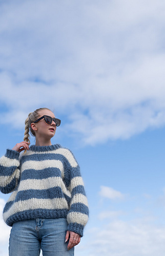 Knitting pattern for fluffy sweater with stripes. Chunky sweater with oversized fit. Knitted in double thread Fluff mohair. Digg thick and fluffy striped sweater. Easy to knit - lovely to wear. Loose fit, with wide sleeves. Normal length body. Knit from the bottom up with 2 threads Fluff yarn.