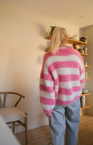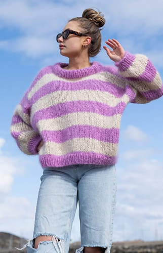Stripes are always in fashion! Make it in your favorite colors. Cool fluffy sweater with an oversized fit. Knitted in double thread Fluff mohair which makes the sweater chunky and good. Mohair sweater with stripes on thick needles - perfect for beginners.