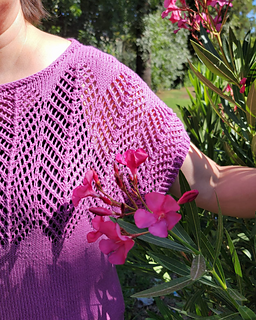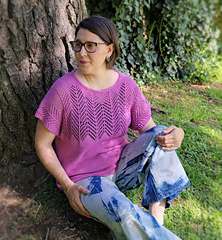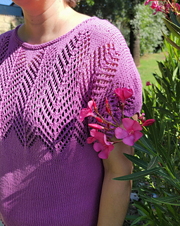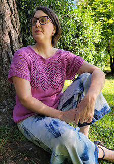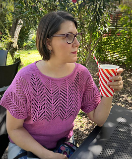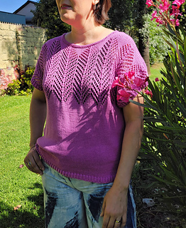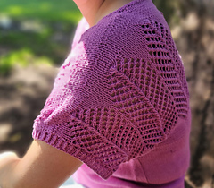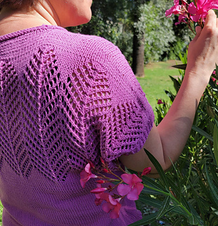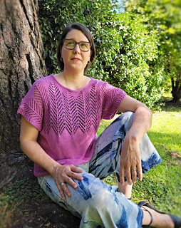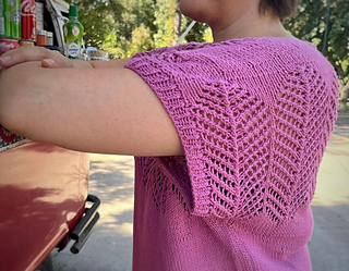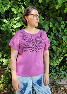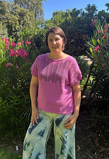 The Marina Blouse features a boxy silhouette with dropped shoulders and generous positive ease. It is worked top-down, beginning at the back with a provisional cast-on. The yoke is worked flat, using German short rows and a lace pattern that naturally defines both the garment structure and the sleeves.