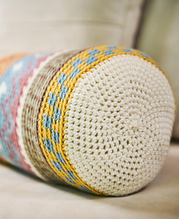 This long Bolster Pillow is worked in the round in one piece. The Pillow Body changes colors using the tapestry method. Hold all colors that are used in any given round throughout the entire round, crocheting over the unused color(s). When switching to a new color, work up to the last pull through with the old color, completing the stitch with the new color.