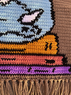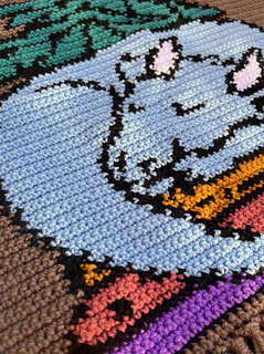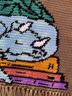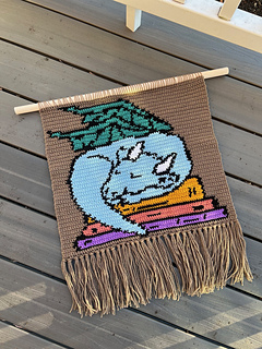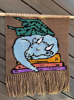 This sleepy dragon is watching over it’s treasure, which of course are books! Any fans of dragons or fantasy books with dragons in them would surely enjoy this wall hanging! It’s made using single crochet stitches and follows a chart or written description of the chart.