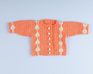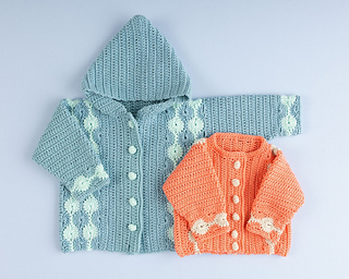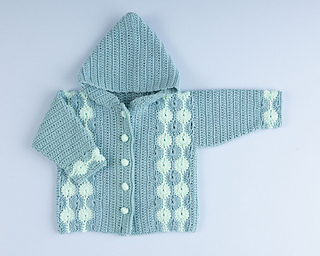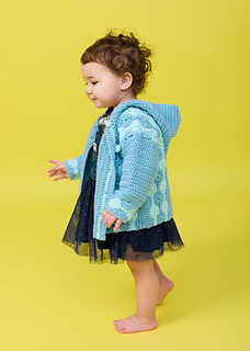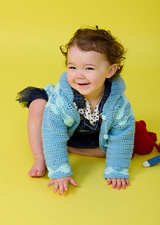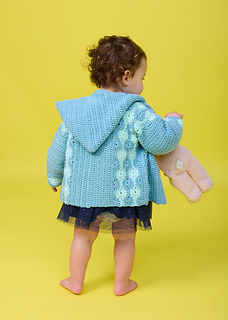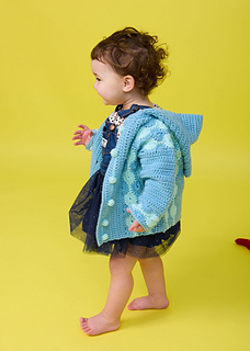 Classic stitches form the foundation for a timeless crocheted cardigan or hoodie! Body and sleeves are worked in single and double crochet punctuated by two–color panels of the Catherine Wheel pattern. The continuous modular construction means no seams to sew. Even the buttons are crocheted as–you–go. Sized from 6 months to 6 years, options include a simple cardigan or classic hoodie.
