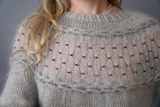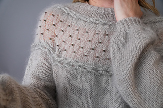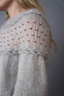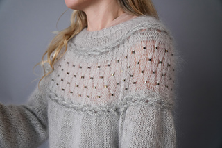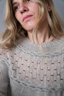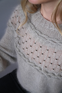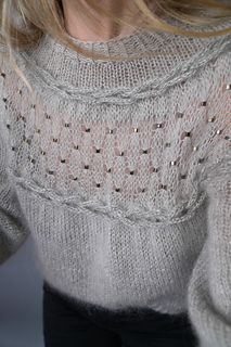 This is an elegant and delicate design, where I wanted to bring together two techniques that are very characteristic of my work. One of them is the use of a single bead worked over three stitches, adding subtle sparkle and texture. The other is a three-dimensional braid created using i-cord, which gives the sweater depth, movement, and a distinctive sculptural detail.