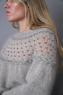 Hilado B: aprox. 75 (90, 100, 125, 140) (150, 175, 190, 200) g / 696 (835, 928, 1160, 1299) (1392, 1624, 1763, 1856) yds o 636 (763, 848, 1060, 1187) (1272, 1484, 1611, 1696) m. / Hilado Sugerido: Isager – Silk Mohair / 60% kid mohair, 40% seda, (232 yds o 212 m / 25 g) /3 (4, 4, 5, 6) (6, 7, 8, 8) ovillos / color: S2.