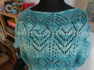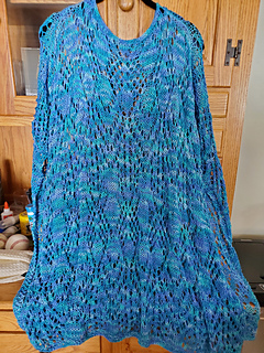 The edges of the poncho are seed stitch with an easy to accomplish slit for the i-cord neck edge. The shoulders are seamed with a 3-needle bo, making a strong, neat seam. All in all this is an easy to make poncho garment. It is knitted on size US 10.5/6.5mm, so works quickly with worsted yarn and the lace just sings! The sides are open, but could be seamed below “sleeve” area. The front and back are identical.
