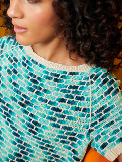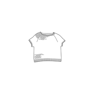 This tee is constructed seamlessly from the top down, featuring a raglan Sleeve and a boxy, semi-cropped bodice. The overlay colourwork pattern is achieved by only ever working with one colour at a time. The ribbed collar is shaped through decreases and increases, ensuring a proper fit around the Neck. The same ribbed detail is added around the cuffs and hemline for a cohesive look.