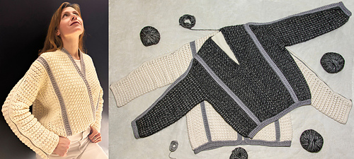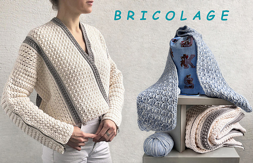 Welcome the BRICOLAGE cardigan and pullover sweater, a crochet exploration of contrasts: smooth and textured, structure and softness, light and dark, calm and bold.