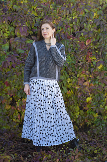 Yarn amounts are given for two body lengths measured from shoulder to hem: 63 cm = 24.8’’ and 56 cm = 22’’. To change the length of body, add or subtract stitches after finishing sleeve. Yardage for the length 56 cm = 22’’: from 1770 to 2620 meters (from 1935 to 2865 yards) - see preview for each size.