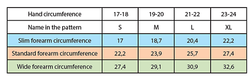 - Size is chosen based on the hand circumference measured at its widest point, typically just below the fingers, excluding the thumb, in centimeters. If you fall between sizes, choose the larger one. Negative ease is already built into the grading.