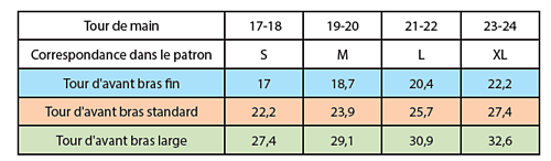 Choisissez l’ajustement avant bras (fin, standard, large) en fonction de la mesure que vous obtenez en mesurant votre avant bras à environ 10 cm de votre poignet. Pensez à prendre en compte votre pull si vous souhaitez les porter par-dessus. La mesure donnée est strictement celle obtenue, il n’y a pas d’aisance négative incluse. Vous avez donc une marge d’extensibilité d’environ 1,5 cm.