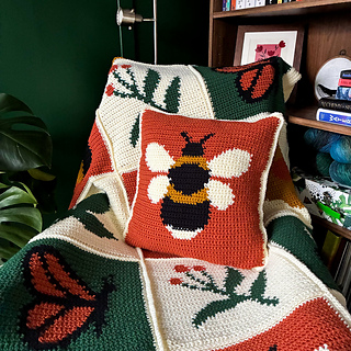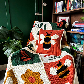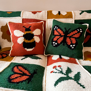 This cushion is part of the wider Bloom & Buzz collection, which also includes a coordinating butterfly cushion and the Garden Medley Blanket. All of the designs share the same garden-inspired motifs and color palette, making it easy to mix and match pieces or create a cohesive handmade set for your home.