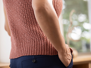 First, the back is worked, with sloping shoulders shaped using short rows. The shoulders are then joined, and the back is worked with increases for the armholes and to the desired length.