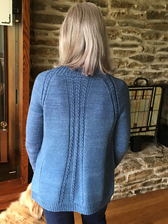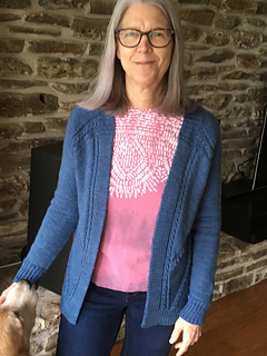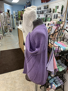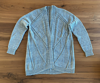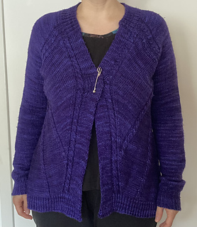 The Cable Stayed Cardigan is an open front, seamless and top-down raglan cardigan with unusual construction: First, the yoke is worked as for a traditional raglan cardigan, but without fronts; only the back and sleeves are worked. When the yoke is finished, stitches for the fronts are picked up along the front sides of the sleeves, and the body is worked top down. The fronts are shaped with increases at the sides, starting from underarms, and decreases at the center. There is some waist shaping at the back for a flattering fit. Most of the body is worked in stockinette stitch, while the wedge-shaped areas where increases are worked on the fronts, waist shaping at the back, and raglan ‘seams’ have a cable pattern on reverse stockinette stitch background.