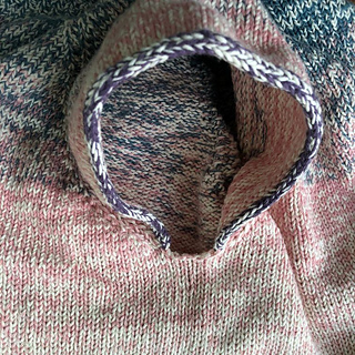 This design relies on the yarn to create variation. The combination of a colour-changing cake yarn with a solid cotton strand produces a soft marled effect that shifts naturally across the garment. The icord finishes at the sleeves and hem add a clean edge that frames the shape without adding bulk.