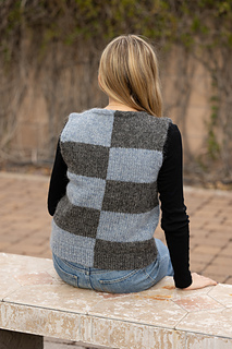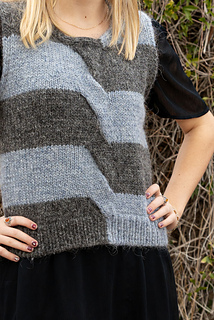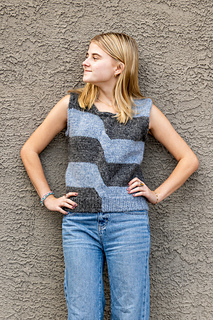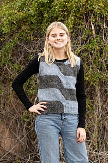 Call and response may be found in music, dance, cheers, and protests, among other places, when something is initiated and then imitated in an interactive way. The Call & Response Vest is worked in stripes, with the first half of each row worked in one color (the call), and the second half (response) mirrors the call in a contrasting color. In a literal twist: a cable at the front, the two colors switch order between stripes.