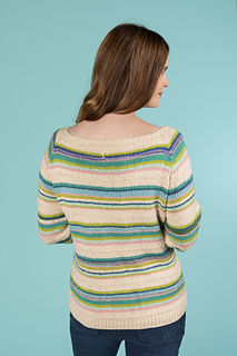 Raglan pullover with scoop neck. Yoke is worked from the top down in the round, with raglan shaping and German shortrow shaping for the back neck. Sleeves are divided from yoke and placed on hold while body is worked to the hem. Then ¾-length sleeves are worked back and forth in rows to the cuff. Pullover is worked in Stockinette stitch with accents of Seed stitch.