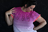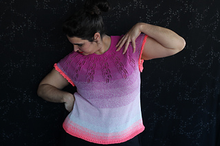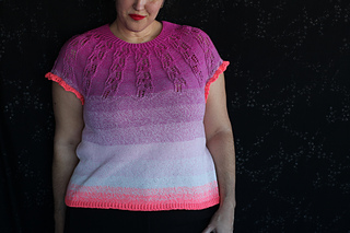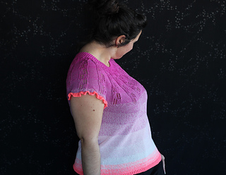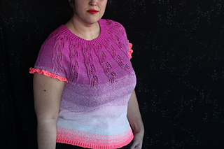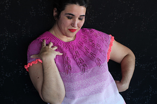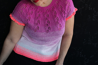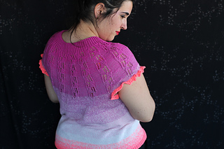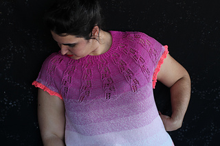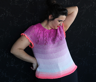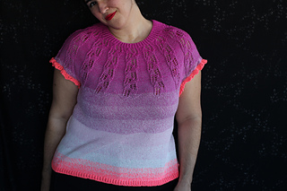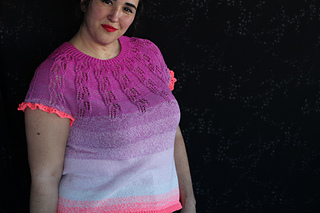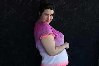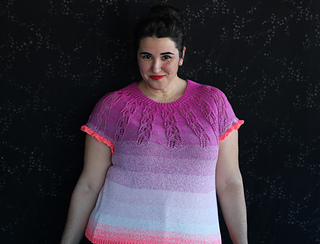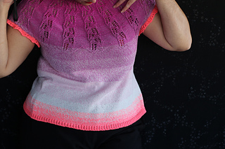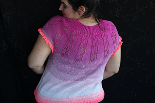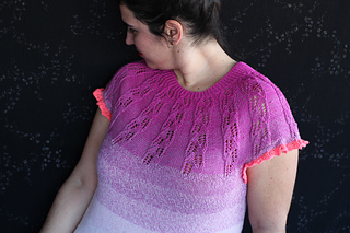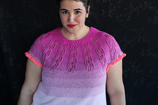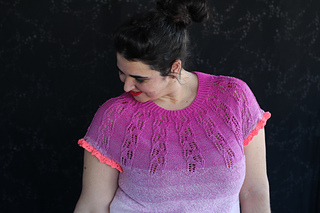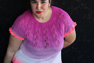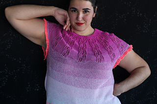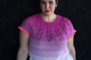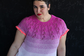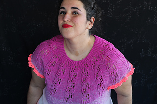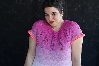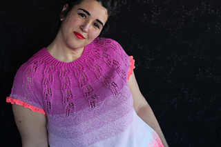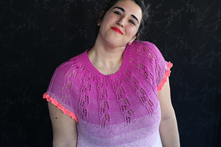 Este patrón tiene un montaje top-down de arriba-abajo sin costuras, tejido circular. El cuello se hace con un elástico retorcido, las vueltas cortas del cuello forman parte del mismo elástico. Después tiene un canesú con un motivo de calados. Las terminaciones son con cierre italiano en el bajo, las mangas están rematadas con un volante calado