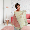 Two triangular pieces with eyelet edges start this project, which then get joined with a simple crochet stitch in the middle. The second color grows the sides of the bigger triangle with stockinette stitches and a pretty diamond shaped lace pattern along with contrasting garter rows. The contrasting color also gets added to the overall top part and a stretchy bind off, done with both colors held together frames the entire shawl nicely.