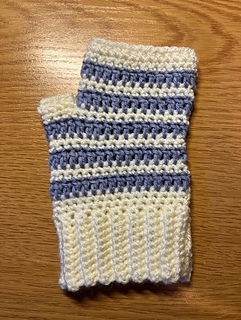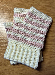 The ribbed cuff is worked first in rows then joined before the remaining mitten is worked in the round. Colour changes are made after the slip stitch.