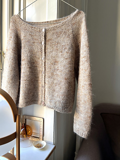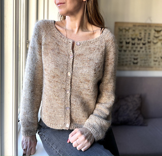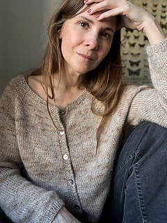 The cardigan shown in the photos is knitted with 2 strands of Baby Alpaca Lace from Kremke Soul Wool in color 2, held together with 1 strand of Silk Mohair from Siesto Fibres in the color Støvrøg.