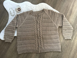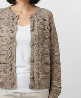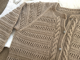 GARMENT CONSTRUCTION: This lovely cardigan is worked seamless from the top down with cable and eyelet pattern all over, front and back. Button band is worked at the same time. Sleeves are worked in the round with the same pattern. Neckband is finished last. Increases are made along every Raglan seam on alternating rows.