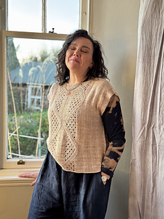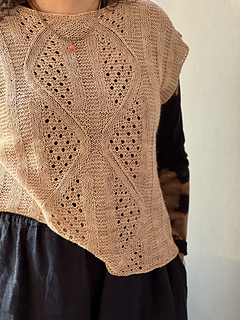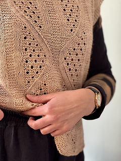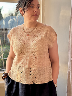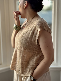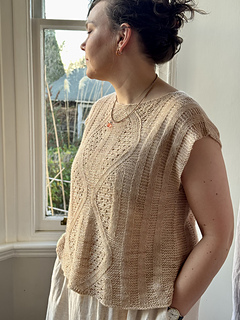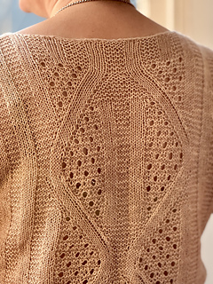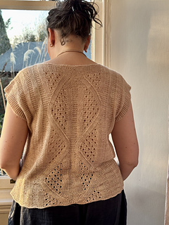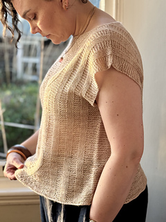 then joined in the round at the armhole base and worked in the round to the hem. Simple short rows are used to shape the Back Neck and Front Shoulders.