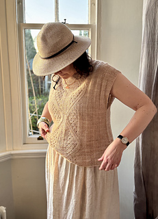 The Carstramon Top is named after an ancient oak wood in Dumfries and Galloway which is renowned for its spectacular springtime bluebell display. The design is inspired by Scottish bluebell woods, walking along a path in amongst the bluebells and weaving in and out through the woodland trees. These ideas translate into the design of this sleeveless top through the garter stitch lace sections, and their contrast with both the strong vertical and meandering lines of stocking stitch.