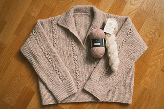 Modellen er strikket i størrelse 2 med et bevægelsesrum (positive ease) på 29 cm. omkring brystet.