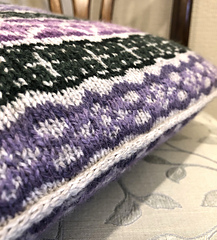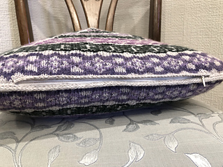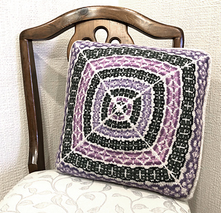 A cosy colour work cushion inspired by formal garden plots. Neat rows of flower motifs are separated by trellis all arranged in a perfect square.