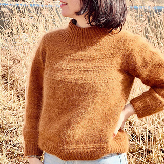 Cembro is a round yoke pullover worked seamlessly from the top down, with a textured pattern on the yoke but also at the cuffs and the hem of the body. Work starts at the neckband. The body and the sleeves are divided at underarm, and worked separately from the top down. The body is completed first, after which you work the sleeves.