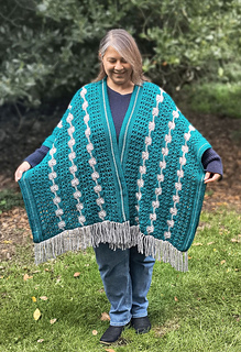 This Chain of Stars Poncho combines elegance and comfort, featuring the beautiful Catherine Wheel stitch with a metallic thread to give it a subtle sparkle plus wrapped stitches for texture.