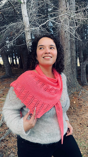 El Chal Miraflores es un chal triangular creciente que se inicia desde la punta, montando muy pocos puntos. A medida que avanza el tejido, se intercalan aumentos y disminuciones que le dan una construcción diagonal, permitiendo que el chal crezca en ancho y largo de forma armónica y fluida.