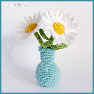 To crochet Chamomile flowers in a vase you should know how to do a magic ring, chain, slip stitch, single crochet, half double crochet, how to make increase and invisible decrease.