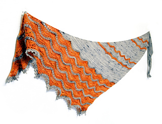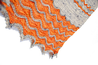 Chamomile Dreams is worked on the bias to make an asymmetrical triangle. Pick two contrasting colors of fingering weight yarn to make the chamomile lace pop.