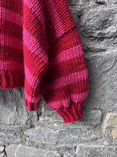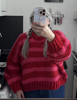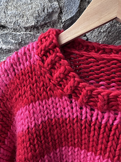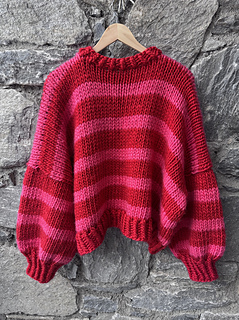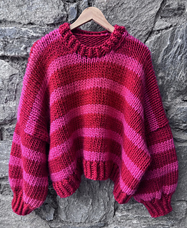 This chunky drop shoulder sweater is knitted from the top down to avoid the need for any seaming. Knitted in stocking stitch, in a simple stripe pattern, it’s a quick and easy knit that will become a firm favourite.