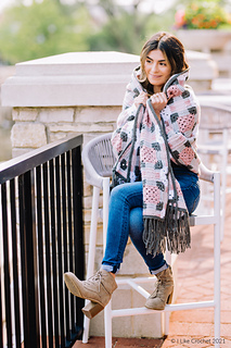 This elegant wrap blends cosy comfort with timeless design, featuring plaid created from carefully placed motifs and finished with a playful fringe. Choose soft pinks and greys for classic sophistication, or explore your own colour palette for a modern twist.