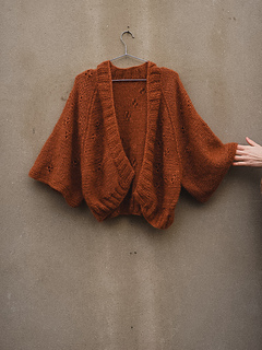 The Cherry Blossom cardigan is a soft and airy knit with a relaxed silhouette, wide 3/4 sleeves, and a length that falls gently to the hips. It is worked top-down holding 3 strands of mohair yarn together on 6 mm needles, creating a light yet voluminous fabric with a beautiful halo effect.