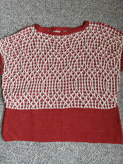 This design from Sandra Nesbitt features an intricate lattice pattern of slip stitches and wrapped stitches, knitted in blue and pale grey. This is complemented by a deep blue lower band and simple edgings, all worked in garter stitch.