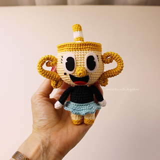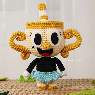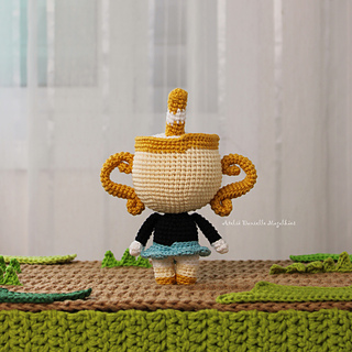 This is a digital crochet pattern (PDF) to make a chibi-style golden cup doll, inspired by a beloved animated character! Written in US English crochet terms.