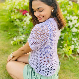 The Chic Mesh Prep top is constructed from two rectangular panels, each worked from bottom up. Back panel is narrower than Front to accommodate bust. Decreases are worked along the armhole and in the last few rows for the neckline. Panels are joined at the shoulders and sides. Sleeves are worked directly into the armholes, in turned rounds. Ribbing is worked separately and seamed at the neckline and sleeve edges using a slip stitch seam.