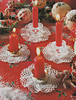 Red candles are paced in the centre of the doily that has a raised centre for A and B doily. Doilies placed on red tablecloth with Christmas decorations/figurines.