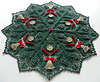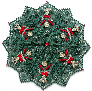 Many people dislike the way the yarn color changes, causing a thread to drag along the back side that’s visible on the front side. In this doily, all the “Christmas tree ornaments” are knitted separately, and there are no thread drags along the back side.