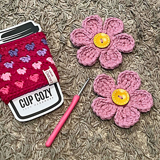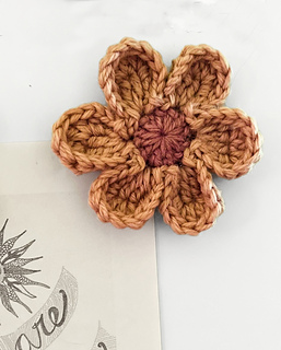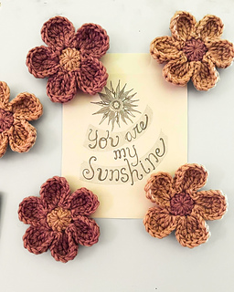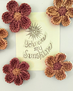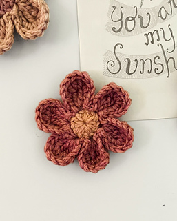 - Flower Size: Varies with weight and brand of chosen yarn. ~10cm/4in petal to petal in Worsted.