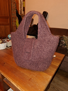 A stylish tote in felt, this roomy bag has an oval bottom, flared sides and a tab closure. It knit in the round from the base up in a single piece, then felted in either a washing machine or dryer. Comprehensive instructions are provided for knitting, felting and shaping the bag.