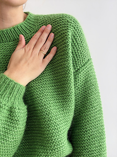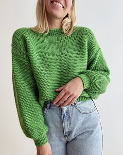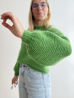 The sweater is knitted in four parts back and forth in rows and then, all parts are sewn together in the end by using the mattress stitch. First, the back part is worked, starting with the bottom hem in 1x1 classic rib and then worked in garter stitch. The shoulders are shaped with decreases for a better fit, then the remaining stitches are bound off with a classic knit bind-off. The front part is worked similar to the back part, the only difference is the additional round neck shaping when working the decreases along the shoulders. The sleeves are then worked separately as well, starting with the cuffs in 1x1 classic rib. After the cuffs, a bunch of increases are worked for a balloon-like and wide sleeve shape. Then, the sleeves are worked as well in garter stitch back and forth in rows. The stitches are again bound off with a classic knit bind-off. After washing and blocking, the shoulder seams are closed with the mattress stitch, the sleeve seams as well (and attached to the body of the sweater) and the side seams are closed too.