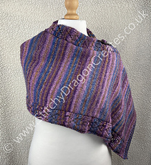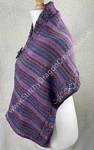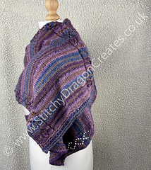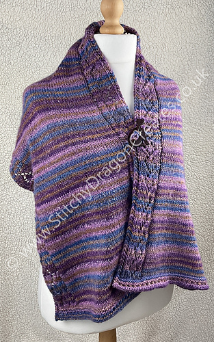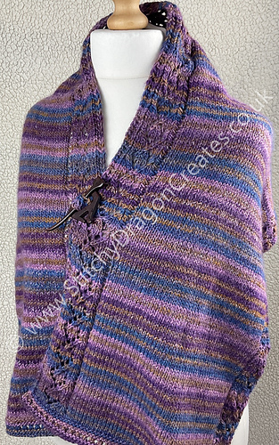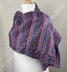 I was delighted to be asked to design a wrap with the new Festival Aran yarn from Cygnet. The colors are just so pretty, and I soon discovered it is also beautifully soft and makes such a snuggly wrap I almost didn’t want to part with it!