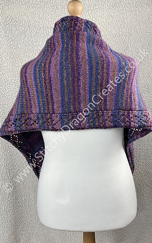 It begins with a garter stitch eyelet border on the short side of the rectangle followed by easy-to-work mirrored lace borders running down the length. Brioche selvedge stitches provide a simple and neat non-rolling edge. It ends with a matching garter stitch eyelet border.