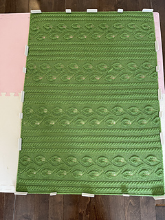 The blanket is worked in one piece with the cable and the leaf patterns, edges are finished with the I-cord.