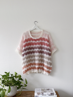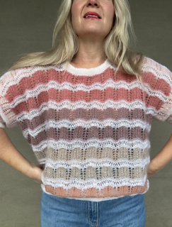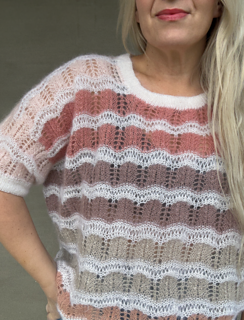 Short-sleeve sample knitted with 2 strands of silk mohair in 6 colors: yht. 9 (10, 10, 10, 14) (15, 16, 16, 16) balls of Knitting for Olive Soft Silk Mohair (225 / 250 yds, 25 g, 70 % mohair, 30 % silk) in colorways Snowflake (main color, white) 3 (4, 4, 4, 4) (5, 5, 5, 5) balls, Cherry Blossom (contrast color 1) 2 (2, 2, 2, 2) (2, 3, 3, 3) balls, Flamingo (contrast color 2) 1 (1, 1, 1, 2) (2, 2, 2, 2) balls, Dusty Rose (contrast color 3) 1 (1, 1, 1, 2) (2, 2, 2, 2) balls, Oatmeal (contrast color 4) 1 (1, 1, 1, 2) (2, 2, 2, 2) balls, Plum Rose (contrast color 5) 1 (1, 1, 1, 2) (2, 2, 2, 2) balls.